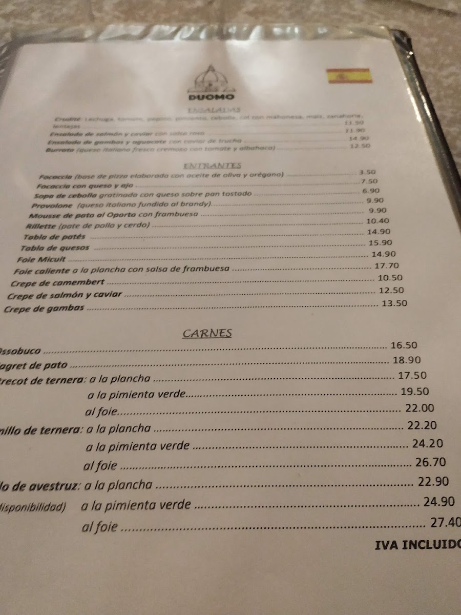 Restaurant Pizzeria Duomo in Benidorm is a true gem offering a rich blend of Italian, French, and creperie delights. The menu shines with authentic flavors and carefully crafted dishes that capture the essence of classic European cuisine. Highlights include the remarkable carbonara, praised for its perfect balance and authentic ingredients, setting a new standard for this traditional favorite. Starters like the provolone flamed in brandy and onion soup with cheese croutons offer warm, comforting tastes that invite you into a cozy experience. For mains, dishes such as cannelloni, lasagne, and a tender, expertly cooked duck dish stand out for their meticulous preparation and exquisite flavor. The menu’s diversity pairs beautifully with the restaurant’s inviting atmosphere and attentive staff, promising a memorable dining journey that leaves you eager to return for the famed tiramisu and more.